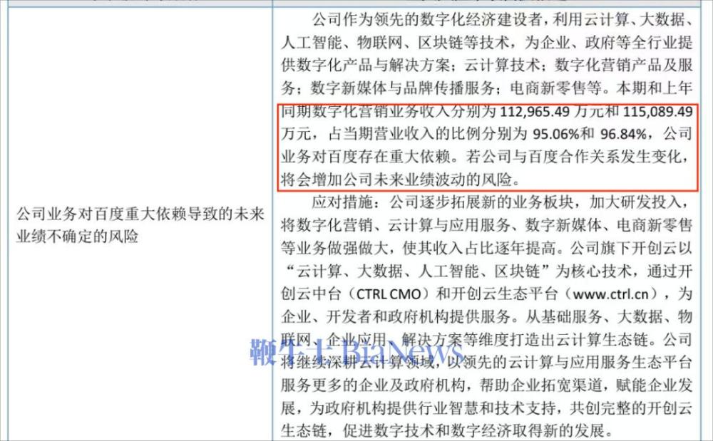 开创集团曾是百度第二大广告代理商,且是新三板上市企业。截至2024年末,开创集团超95%的营收仍来自于“数字化营销业务收入”。公司在2024年年报披露时也曾公开承认:“公司业务对百度存在重大依赖,若公司与百度合作关系发生变化,将会增加公司未来业绩波动的风险。”