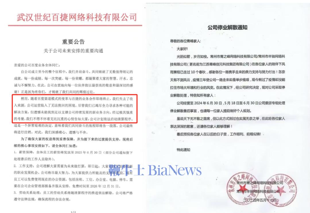 在更早之前的6月,百度在湖北地区的总代理商武汉世纪百捷网络科技有限公司发布声明称,“随着百度渠道模式的变革与公司业务合作即将终止”,公司失去了核心收入来源,运营陷入无法挽回的困境,且未能找到支撑发展的新方向,最终只能依法启动清算。
