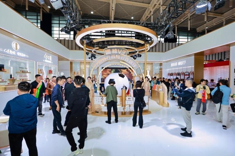 2025年10月,在南京举办的第113届中国秋季糖酒会上,今世缘酒业打造的“国缘V3”主题展厅独树一帜。展厅中央巨大的足球造型吸睛无数,成为热门打卡点,而“国缘V3.苏超联名酒”更是一鸣惊人,成为展会焦点。