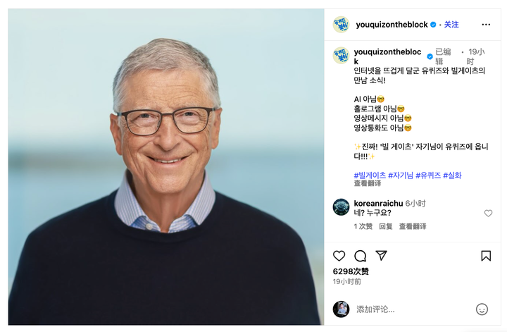 《You Quiz On The Block》方面表示,「不是 AI、不是全息投影、不是视频通话,而是真的比尔·盖茨」。据封面新闻消息,促成这次合作的 CJ ENM 表示:「能够邀请到用科技连接世界、并通过捐款改变时代的比尔·盖茨来做客此节目,我们深感荣幸。」
