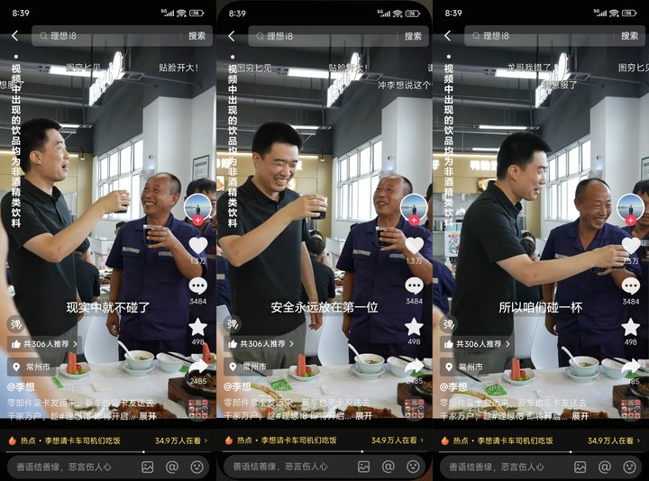 8 月 18 日,理想汽车 CEO 李想发布视频表示,在新车交付前,请卡车师傅(代表)吃个便饭,并配文「零部件靠卡友运来,新车也靠卡友送去千家万户」。