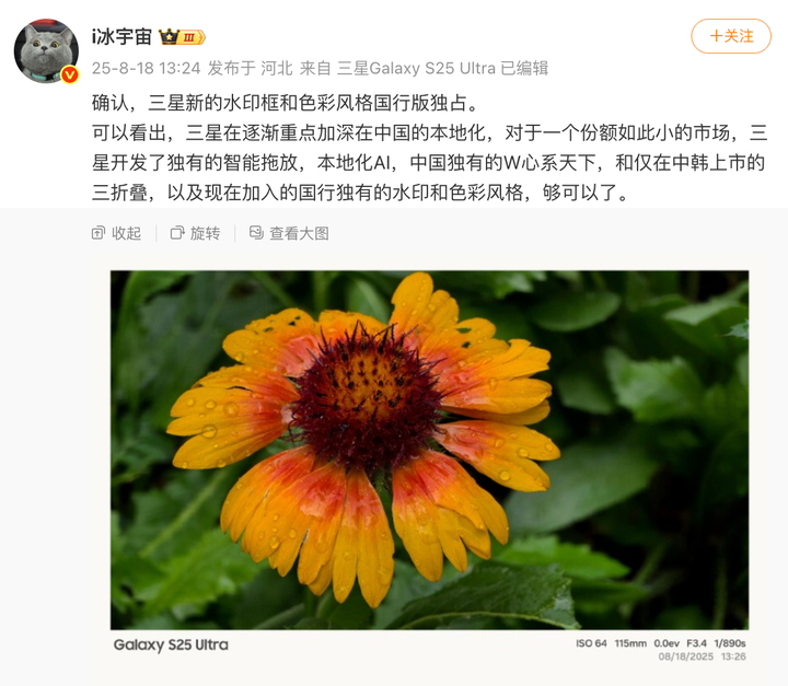I 冰宇宙指出,三星在逐渐将重点加深在中国的本地化。其认为,对于一个份额如此小的市场,三星开发了独有的智能拖放,本地化 AI,中国独有的 W 心系天下,和仅在中韩上市的三折叠,以及现在加入的国行独有的水印和色彩风格,「够可以了。」